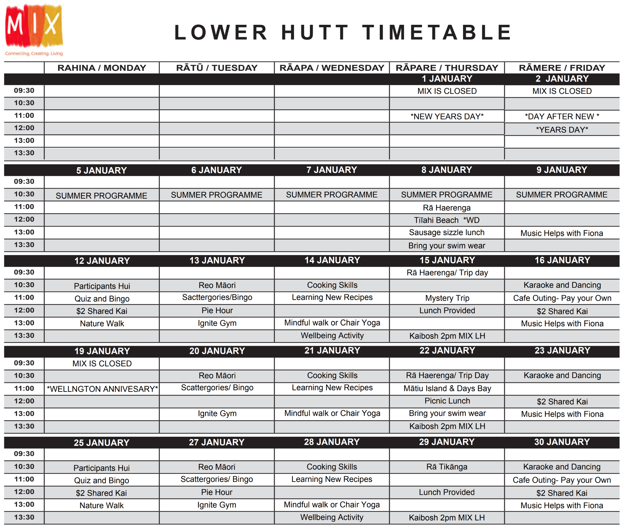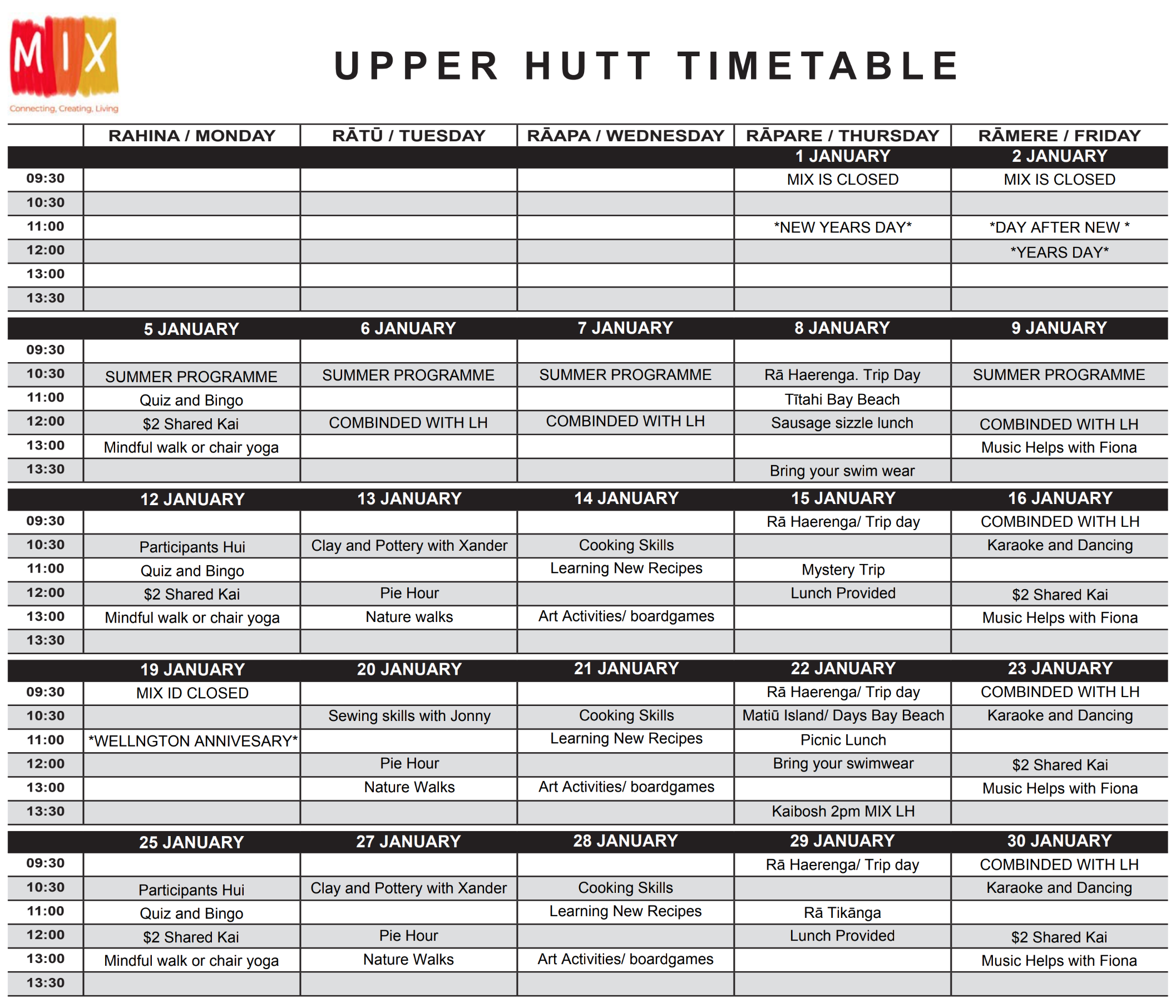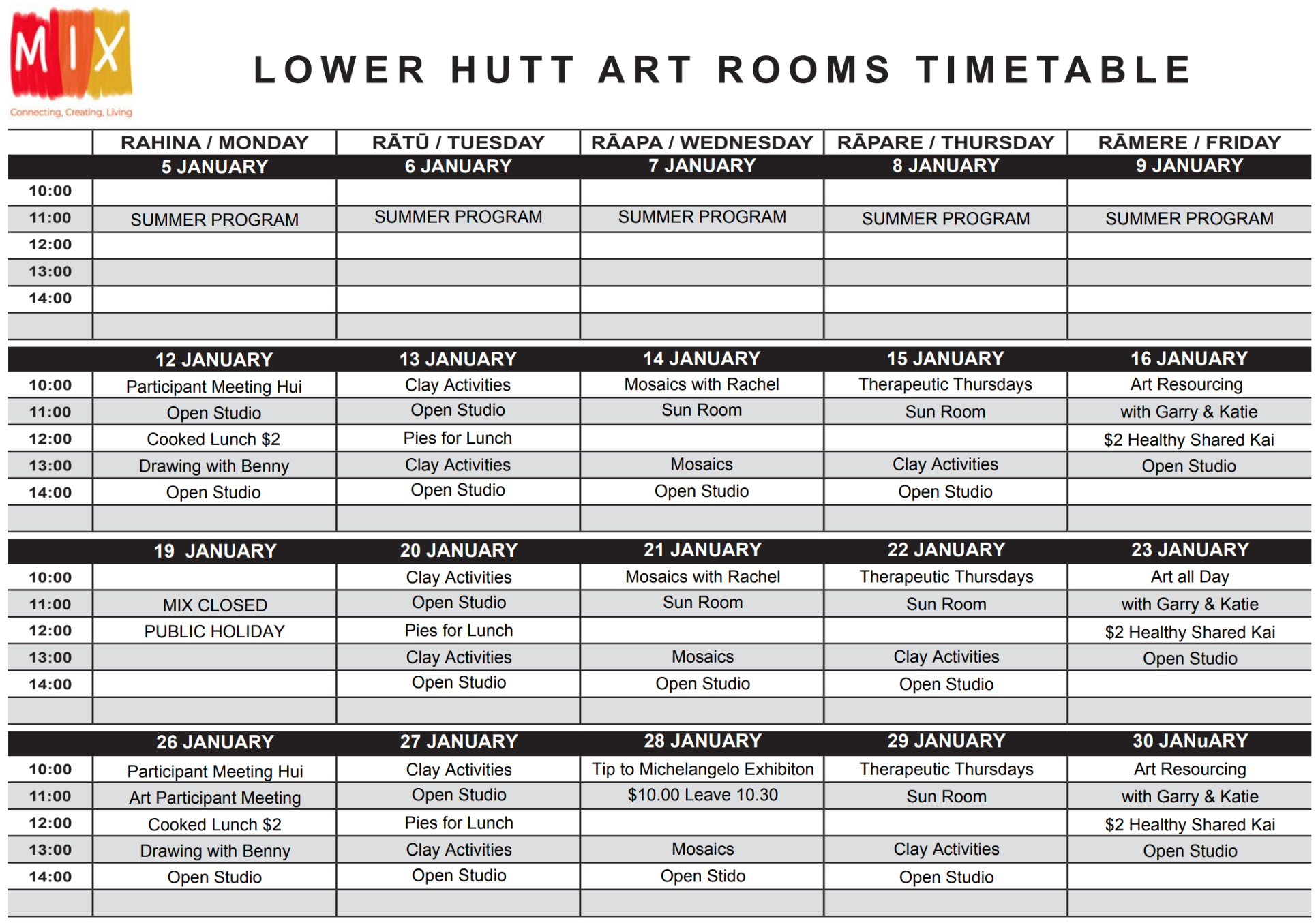 MIX Lower Hutt Art Rooms Timetable