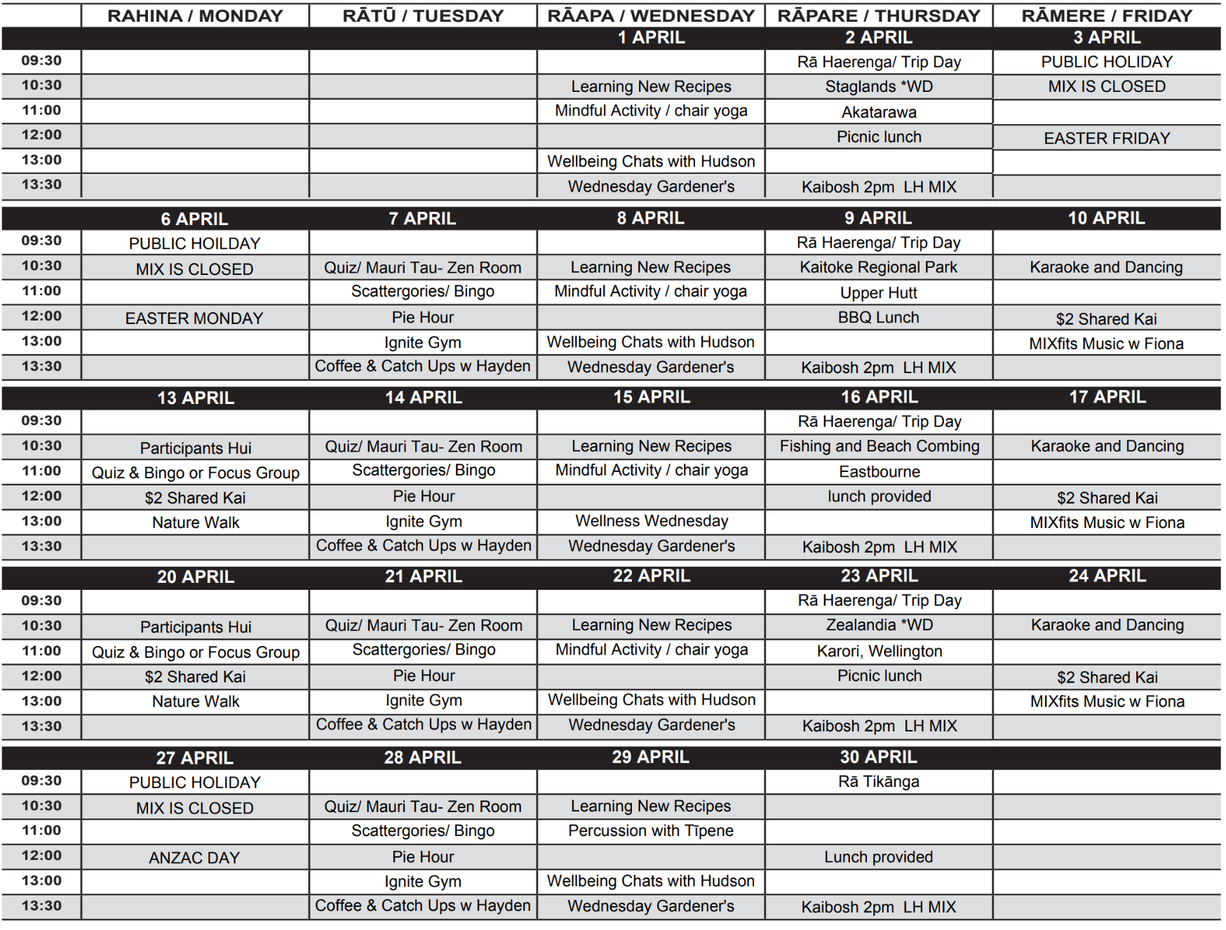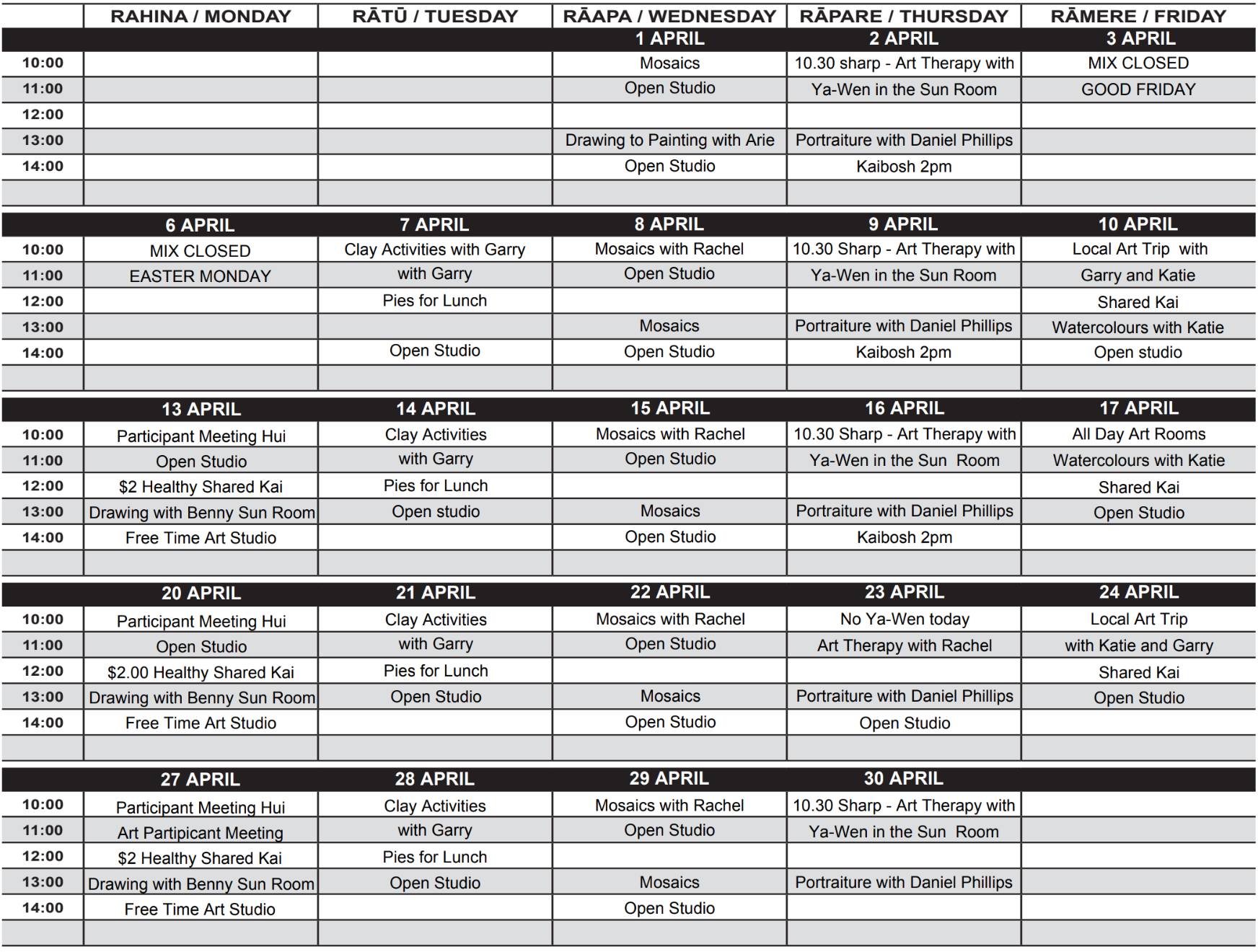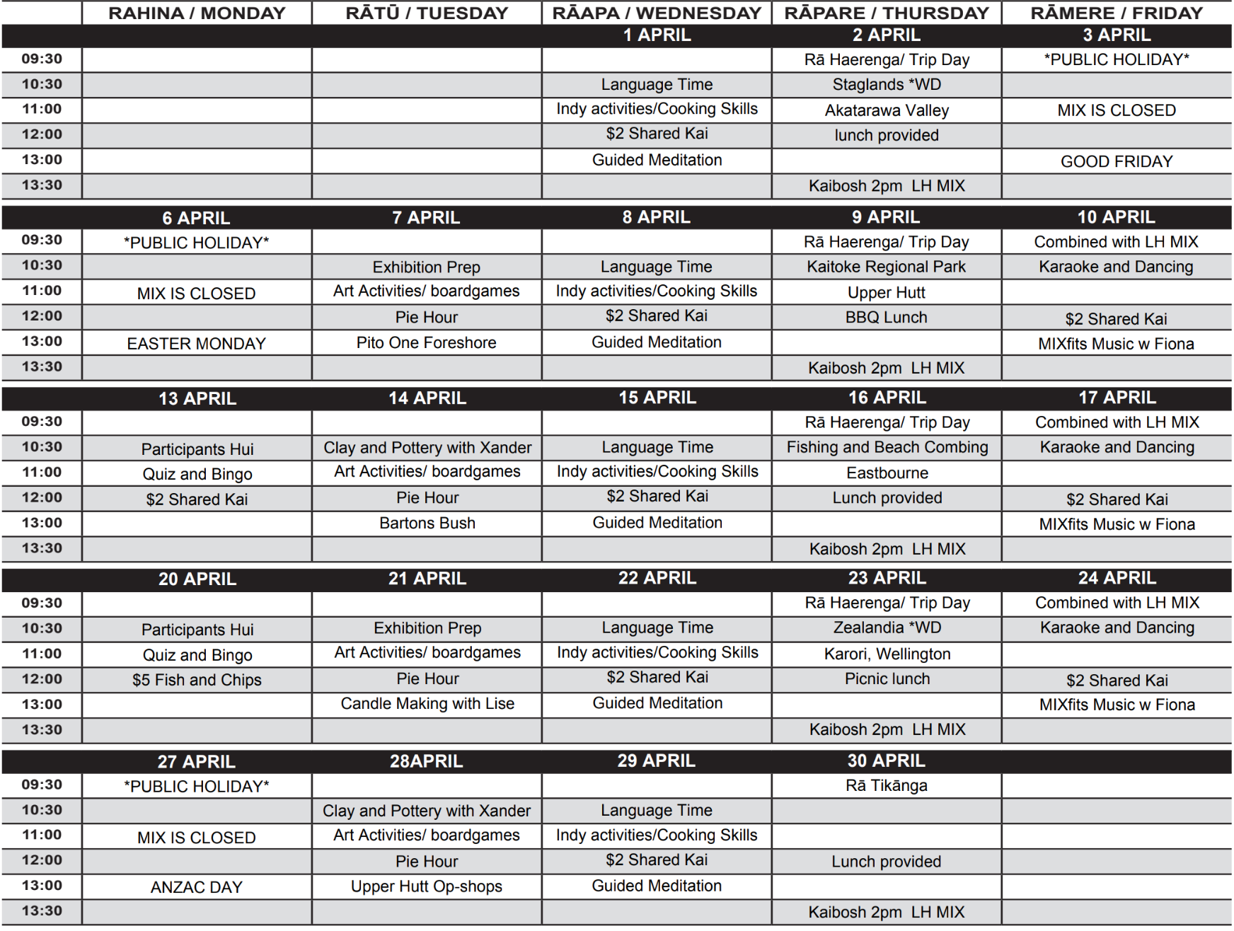 MIX Lower Hutt Art Rooms Timetable