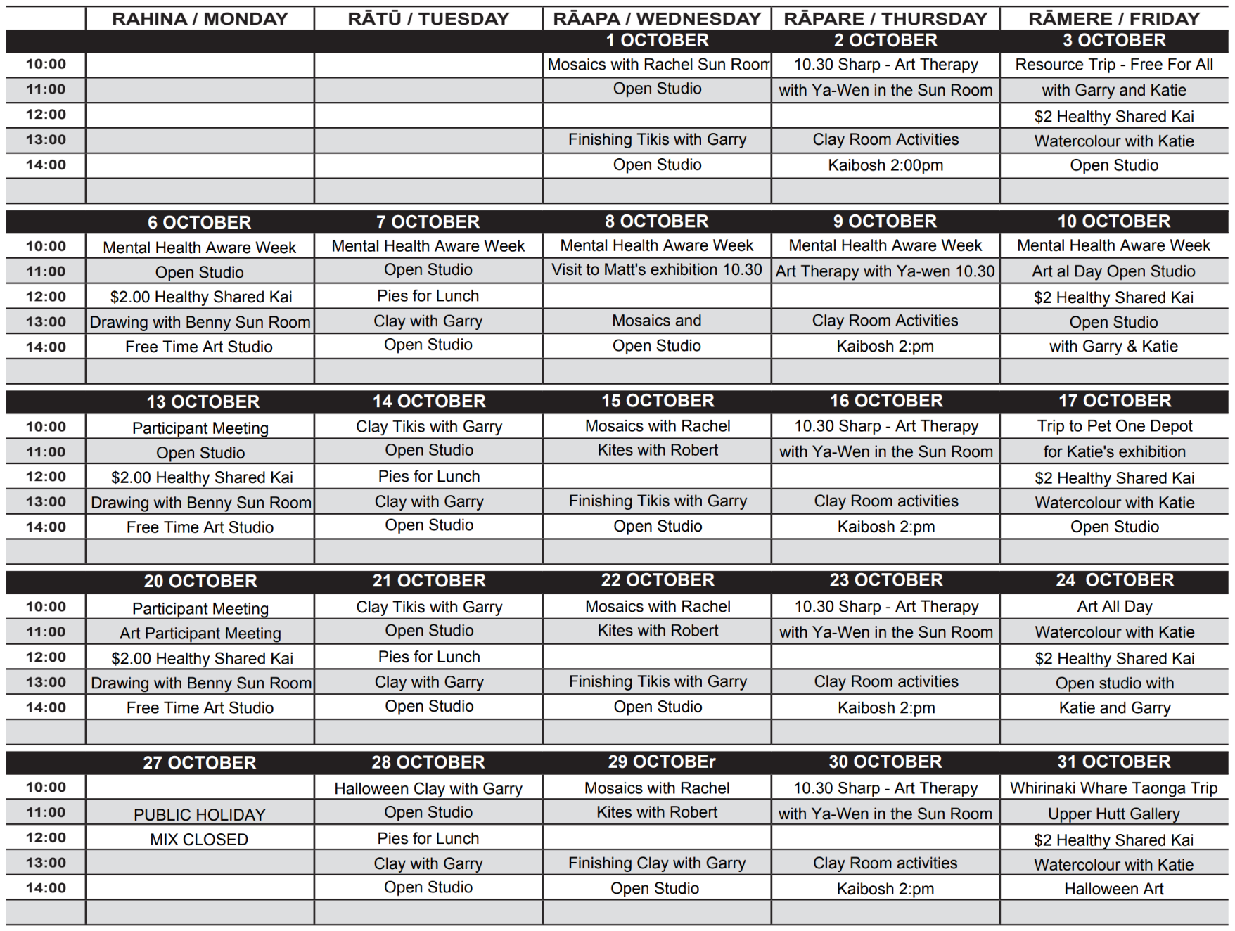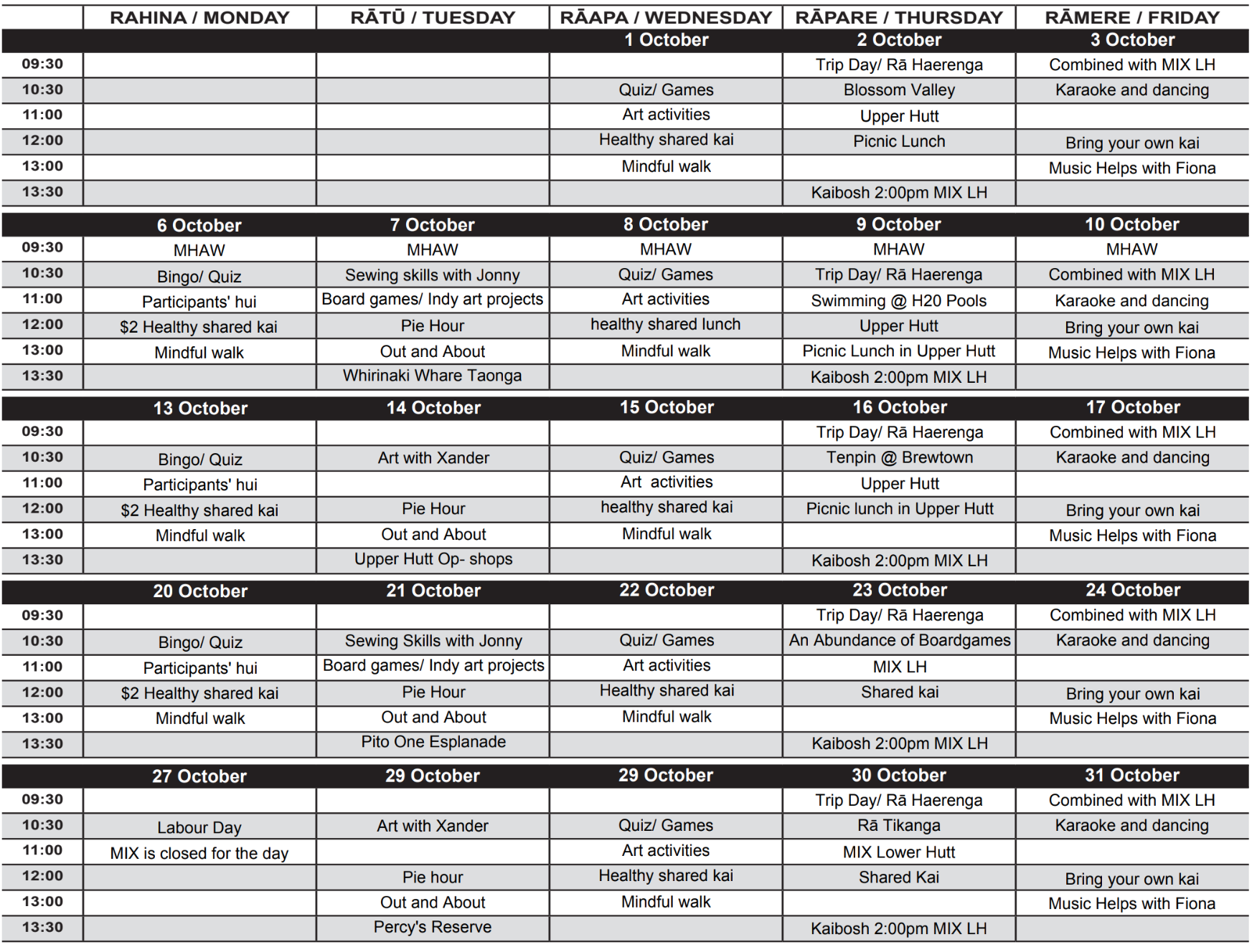 Mix operates across three sites in the Hutt Valley. All sites are open Monday to Friday and the Wellbeing and Art programmes run from 9.30am to 3pm. You can download the monthly timetable or pick it up from any of the three sites.